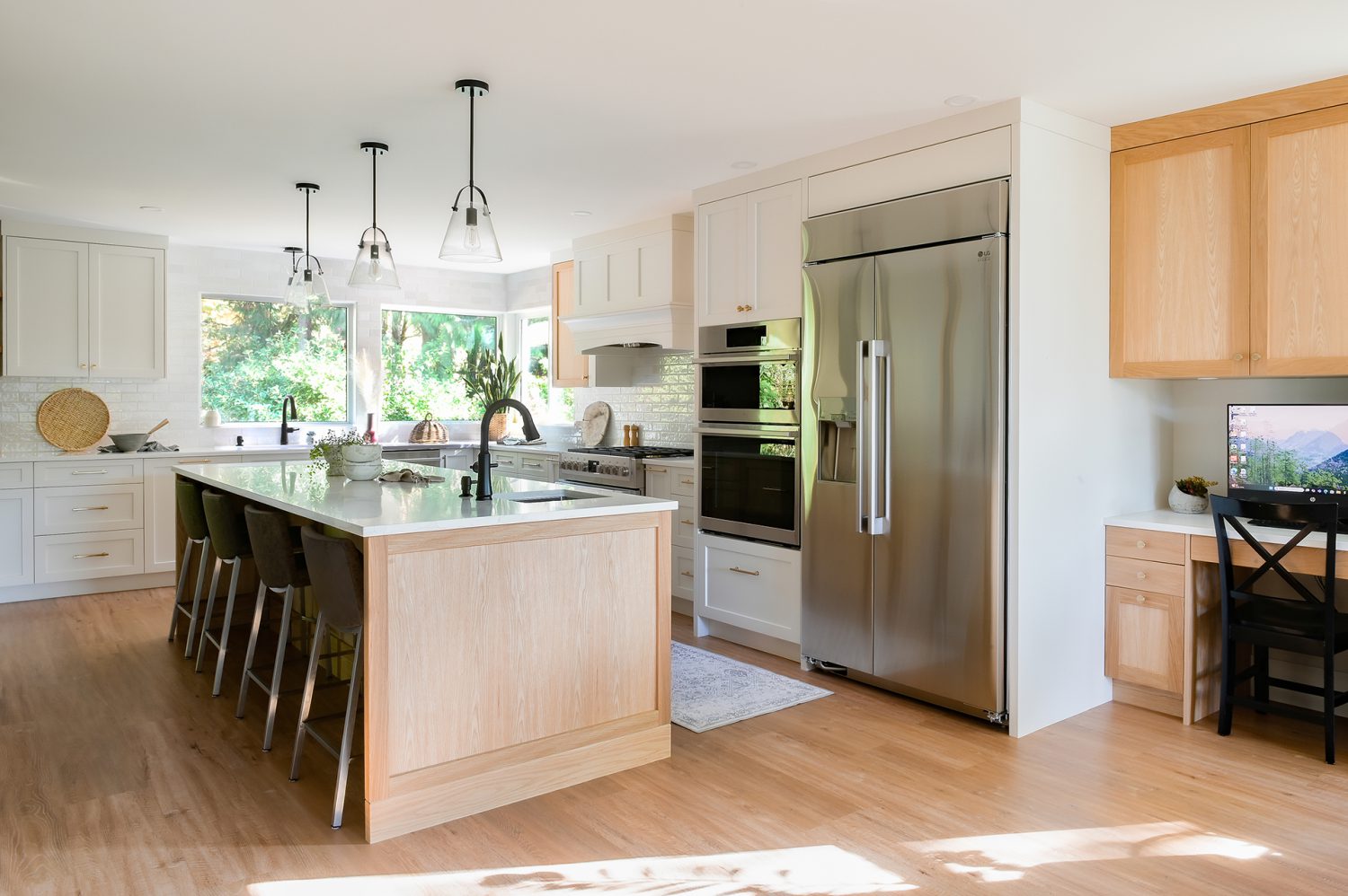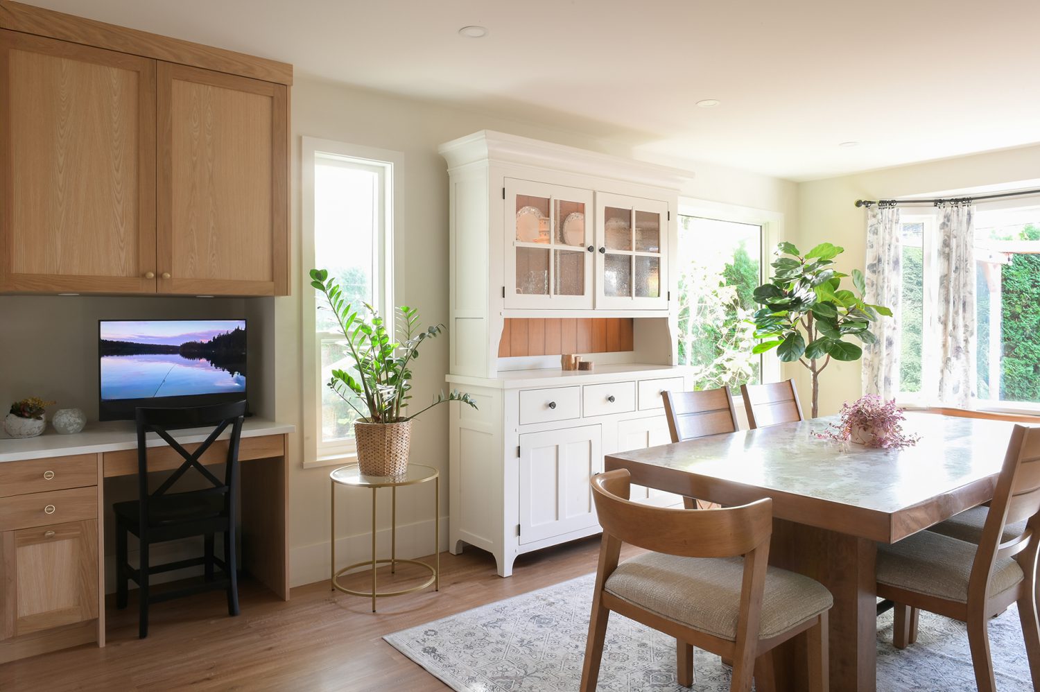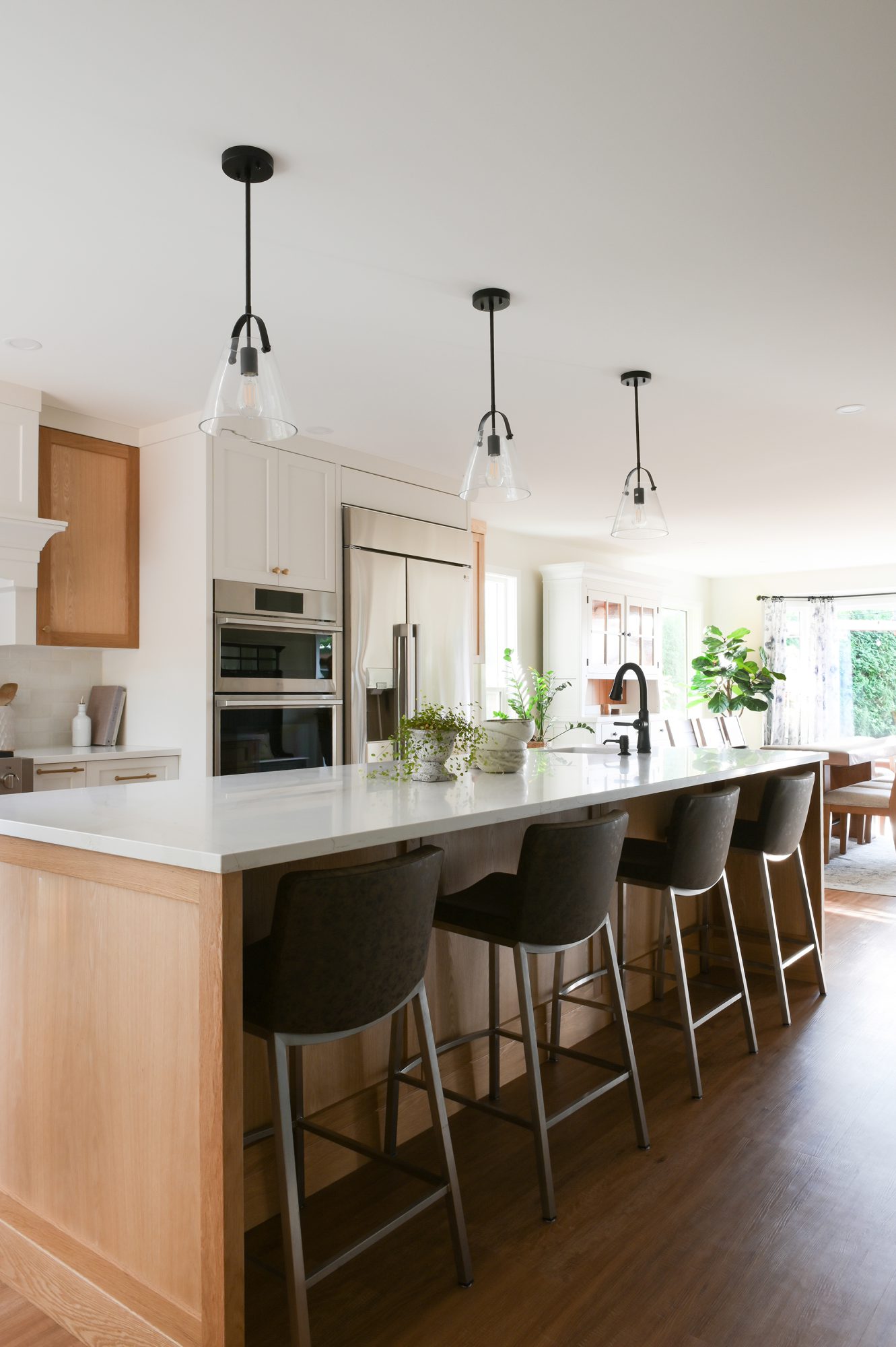 This full main-floor renovation was thoughtfully reimagined to create an open, light-filled living environment that connects seamlessly to the private green space beyond.