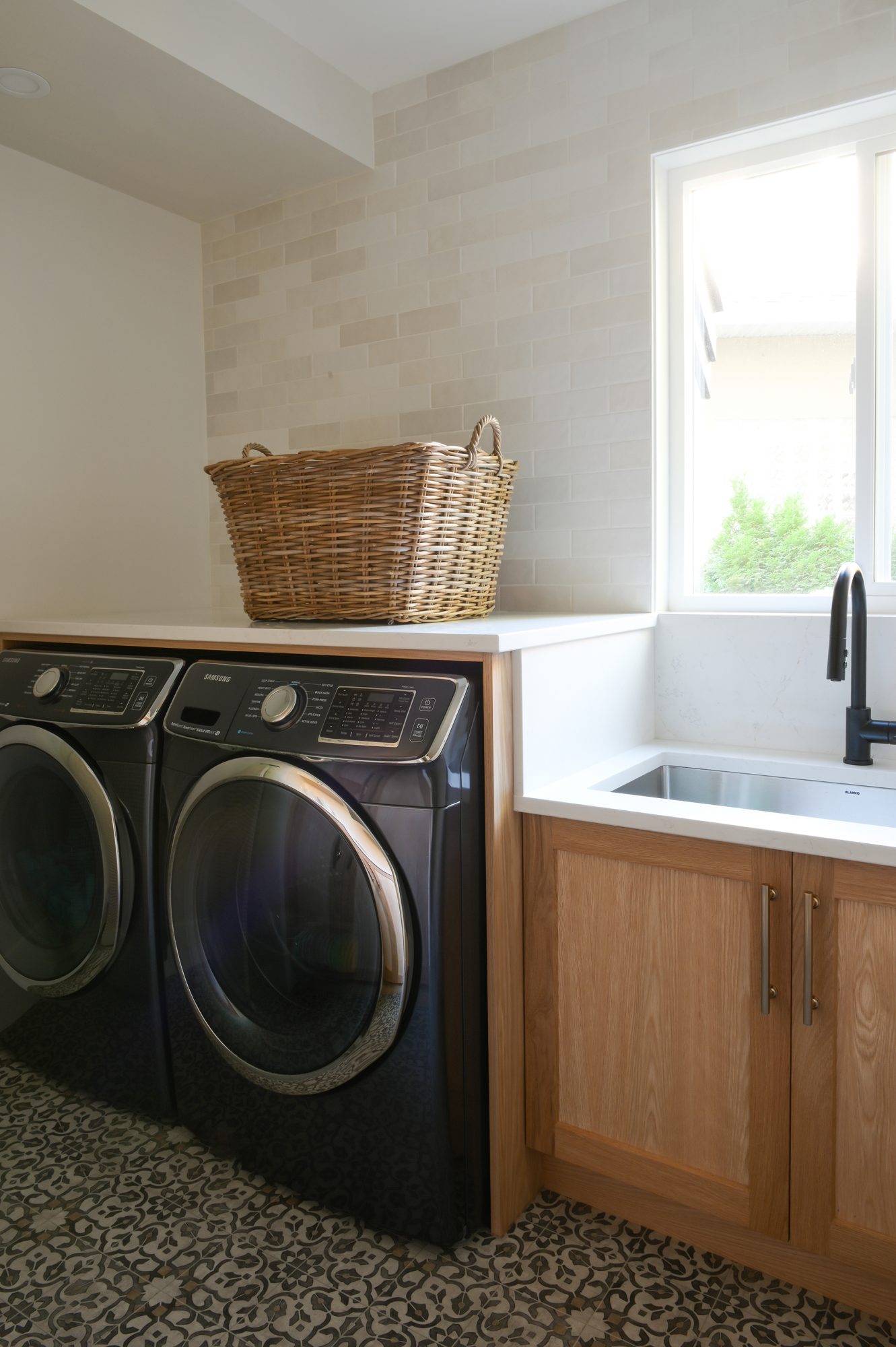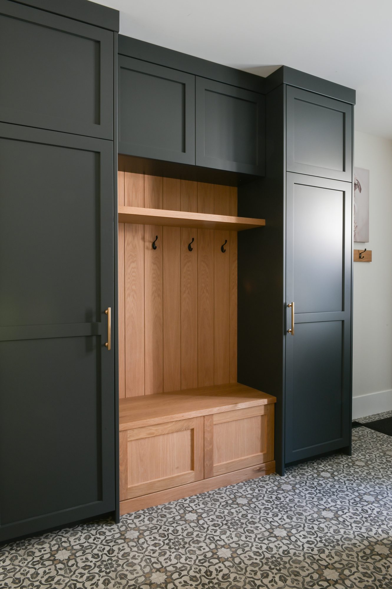 The redesigned layout now feels bright and connected, anchored by custom cabinetry, a handcrafted hood fan, striking full-span beams, a custom mantel, and thoughtfully integrated open shelving. Each wood feature was carefully built in the Alderidge shop, ensuring both craftsmanship and continuity throughout the home.